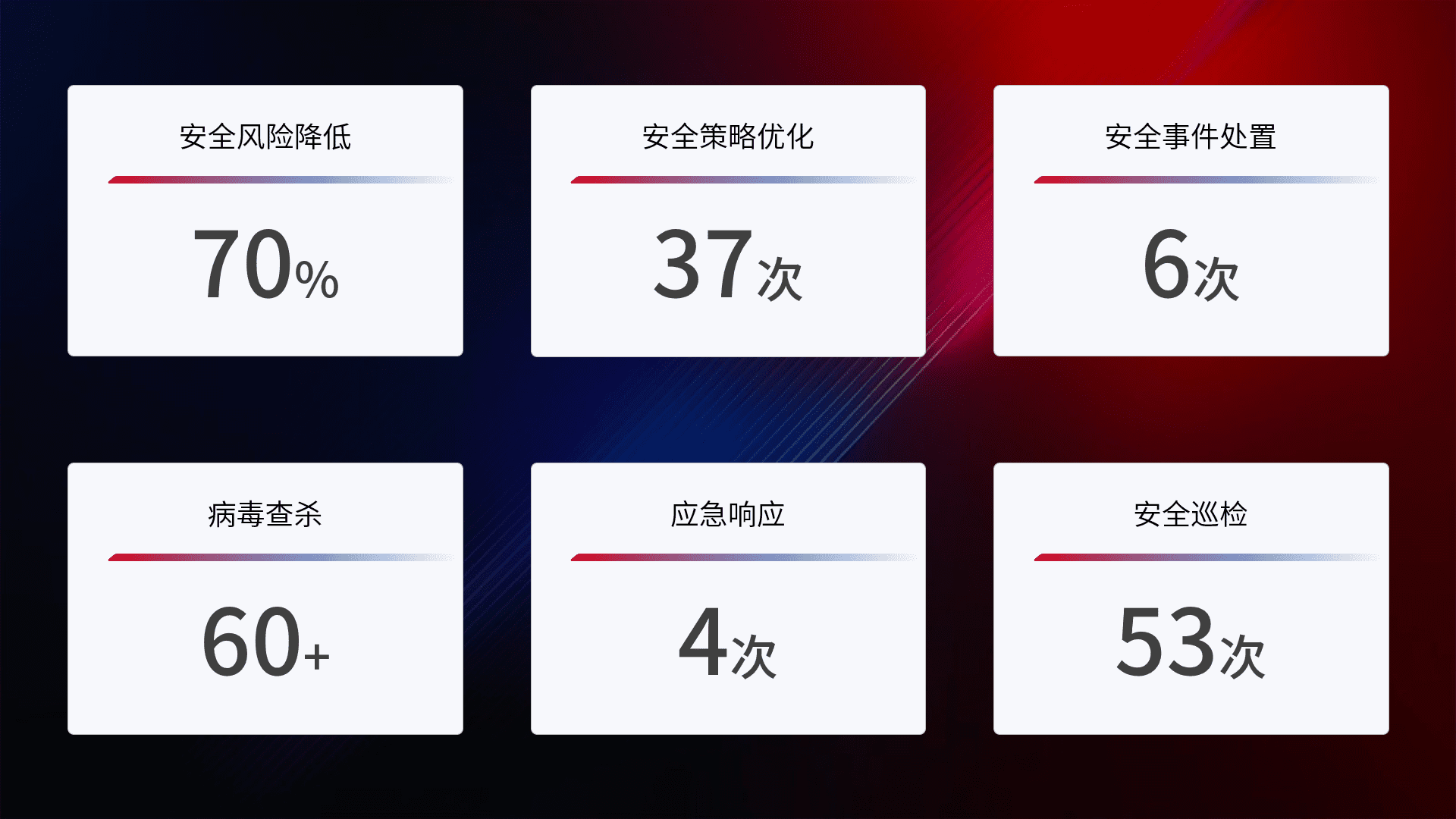 提供全面的安全事件报告体系,,包括处置报告、、、周报、、、、季度和年度总结,,,结合持续监控,,,,帮助客户深入了解网络安全状况。。。。