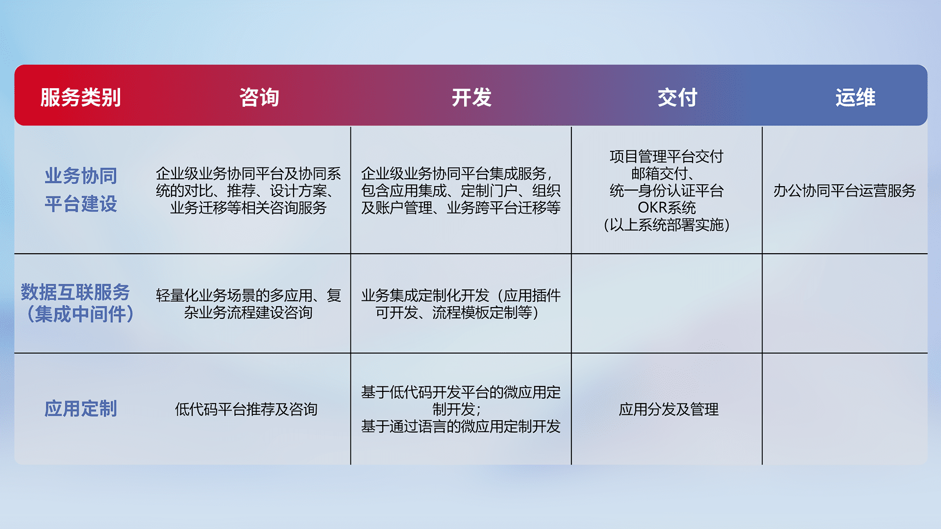 针对钉钉、、、、企微、、IDaas等平台级产品提供产品的规划、、方案、、交付、、、、定制化开发等服务,,,实现如统一协同办公、、、、智能客户服务、、、混合会议管理、、智能数据查询、、、、等业务场景,,实现数字化转型。。